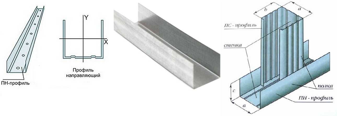Это все виды профилей для гипсокартона, которые используются для сооружения каркаса. Из направляющих ПН собирают «раму», в них вставляют стойки из ПС, которые затем соединяются перемычками (обычно из ПН) — для большей жесткости конструкции