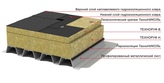 В гражданском и промышленном строительстве в качестве теплоизоляционного слоя при новом строительстве и реконструкции зданий и сооружений различного назначения. Плиты ТЕХНОРУФ Н и ТЕХНОРУФ В предназначены для применения в качестве нижнего и верхнего слоя при двухслойной схеме теплоизоляции в покрытиях из железобетона или металлического профилированного настила.